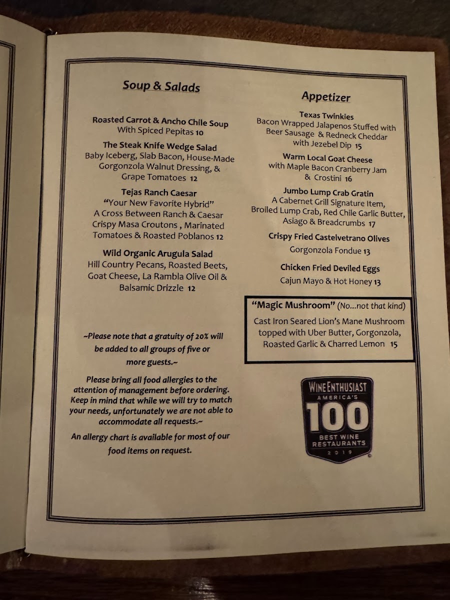 The menu is where Cabernet Grill truly shines, offering a selection that’s both innovative and rooted in tradition. For appetizers, don’t miss the Magic Mushroom — a cast-iron delight featuring seared lion’s mane mushroom, topped with Uber Butter, Gorgonzola, roasted garlic, and charred lemon, elevating each bite with rich and savory flavors. Another standout is the Texas Twinkies, which boast four bacon-wrapped jalapeños, stuffed with beer sausage and redneck cheddar — a true Texan twist that delivers on both heat and flavor.